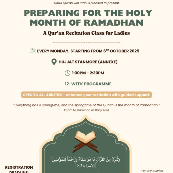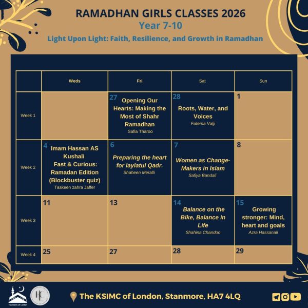 Ramadhan Girls Classes 🌙 This Shahr Ramadhan, the Hujjat Ladies Committee is running a special series of girls’ classes alongside the main hall lectures. đź§• For girls aged 11–14 (School years 7–10) – perfect for…