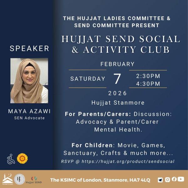 | 2:30 pm - 4:30 pm | SEND Social&Activity Club | Families of children with additional needs are invited to join us for our next event: 🗓️Saturday 7th February Including parallel programmes for children and parents/carers: Children& young people: Parent/carers: 🎉Ending with parachute games & 15th Sha’ban recitations by world renowned recitors🎉 Limited spaces. Hujjat SEND Committee & Ladies Committee | Family Event | N/A | View More |