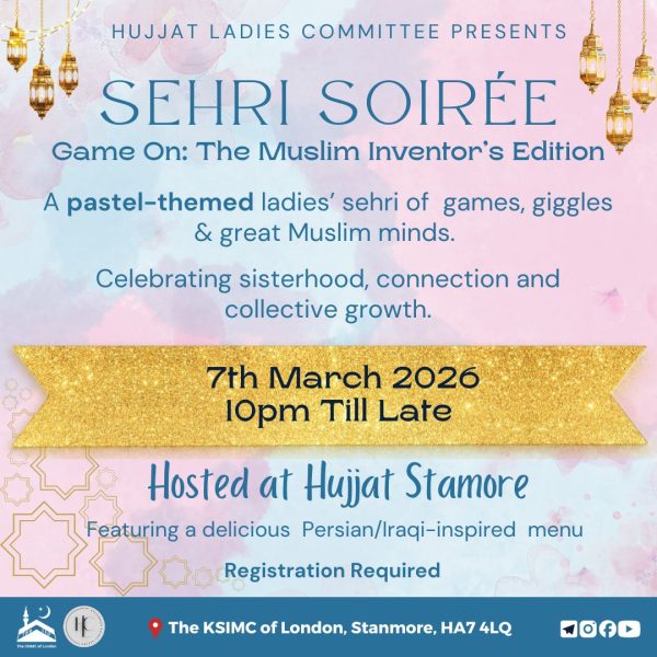 ✨ Hujjat Ladies Committee invites you to a Sehri of Games, Giggles & Great Muslim Minds! ✨ Join us for an evening of fun, laughter, and inspiration, celebrating the brilliance of Muslim inventors. Dress in…