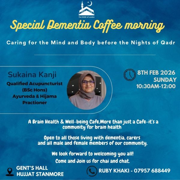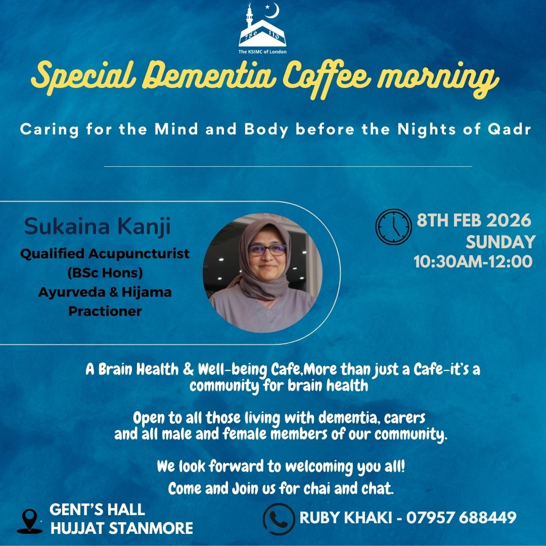 As we approach the most blessed nights of, Qadr, we invite you all to join us for a Special Dementia Coffee Morning. An Inspiring and Practical talk by Sukaina Kanji – A qualified Ayurveda ,…