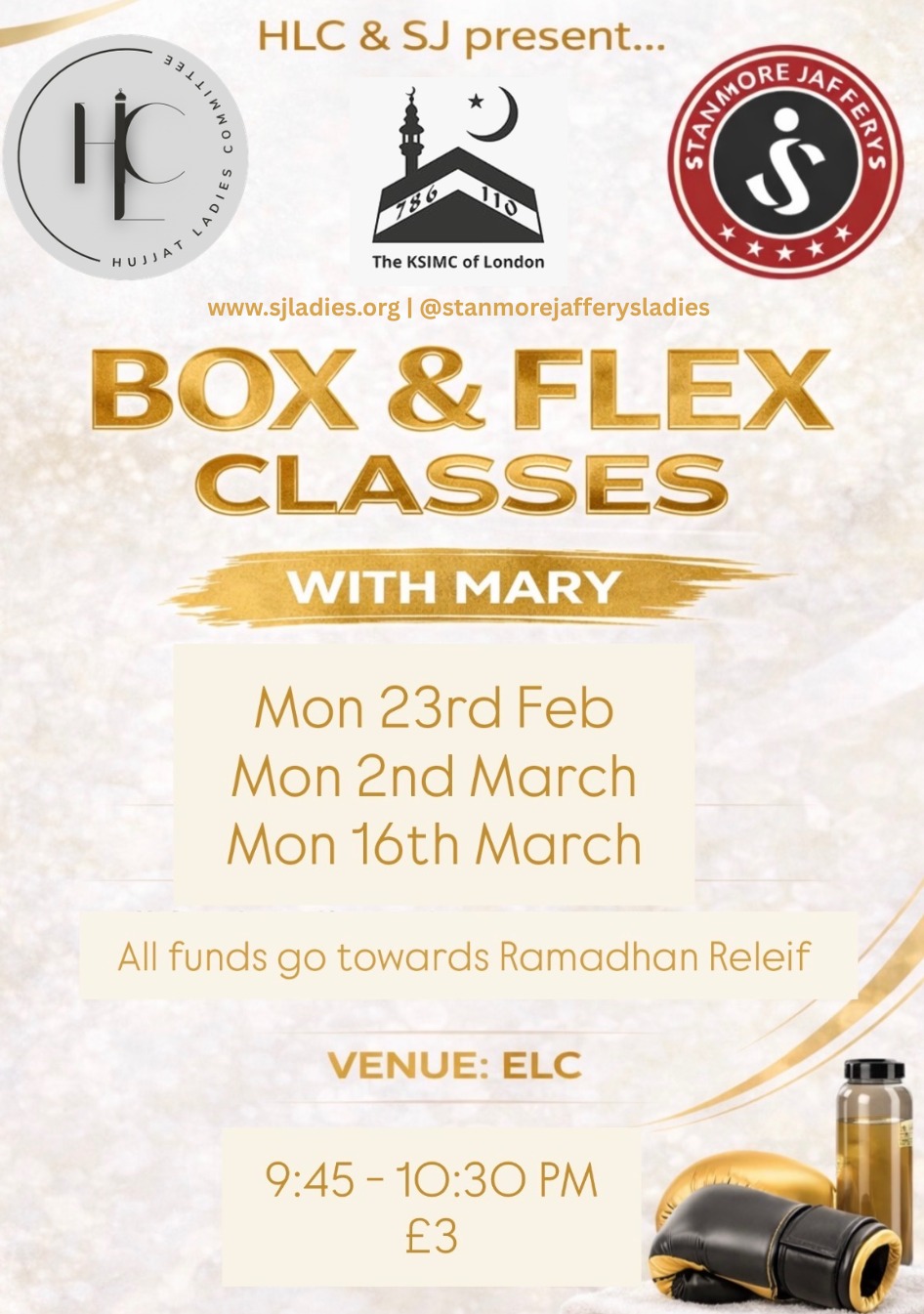 Salaam ladies, hope you are all well 🙂 📣 This Ramadhan SJ ladies fitness have partnered with the Hujjat Ladies Committee (HLC) to raise funds for the Ramadhan Relief Funds by organising Box & Flex…