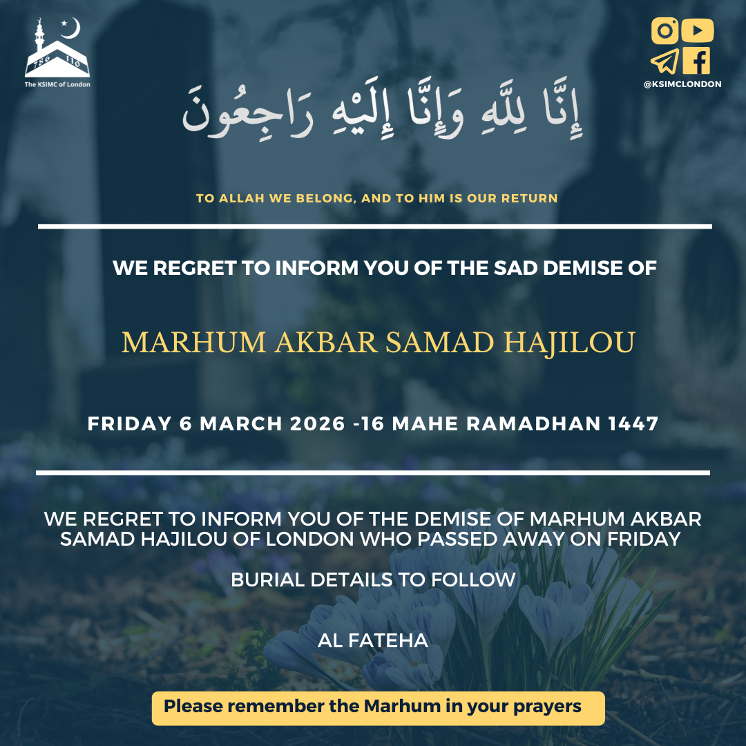 | 5:00 pm - 8:30 pm | Eve 22nd Ramadhan - Shahadat day Imam Ali (AS) | 17:00 - Marthiya - Abbas Ali Muraj | Ramadhan | N/A | View More |