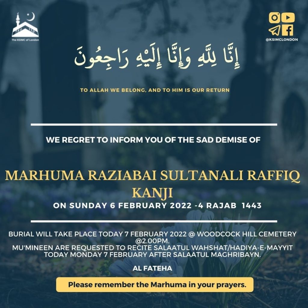 News of Death: Marhuma Raziabai Sultanali Raffiq Kanji