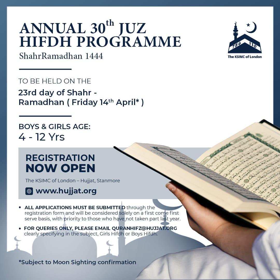 Registration for this years Annual 30th Juz Hifdh programme is now open for Boys and Girls aged 4-12 years