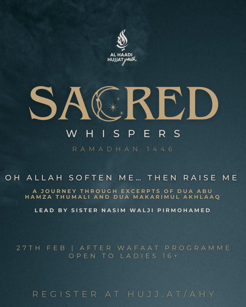 Led by Sister Nasim Walji Pirmohamed, we will reflect on powerful excerpts from Dua Abu Hamza Thumali and Dua Makarimul Akhlaaq, allowing their timeless words to awaken our hearts, soften our souls, and realign us with our journey towards Him.