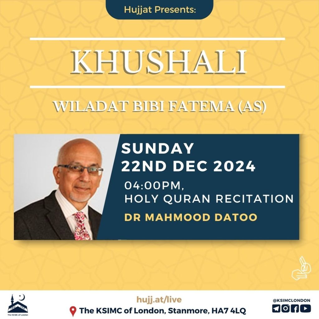 16:45 Majlis / Lecture – Dr Mahmood Datoo – The Virtues of Fatema (AS)