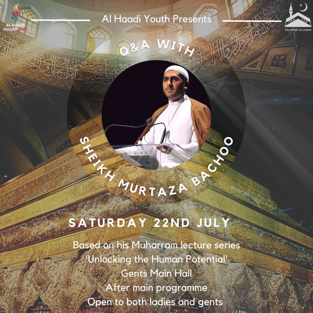 Join Al Haadi Youth this Saturday 22nd July for an interactive Q&A with Sheikh Murtaza Bachoo on his series titled ‘Unlocking the human potential’. The Q&A is open to both ladies and gents, and will start straight after the main programme in the gents main hall.