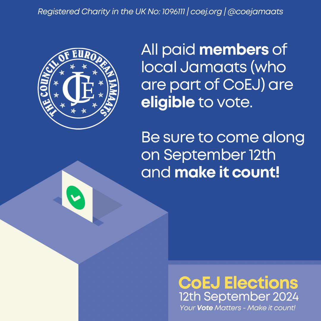 Members have the opportunity to elect the President for our parent body (The Council of European Jamaats “CoEJ”) we encourage all Members to engage in this Election process, please ensure your Membership is paid up to avoid any disappointment on the day. Spouses must also be registered under your Family Membership.