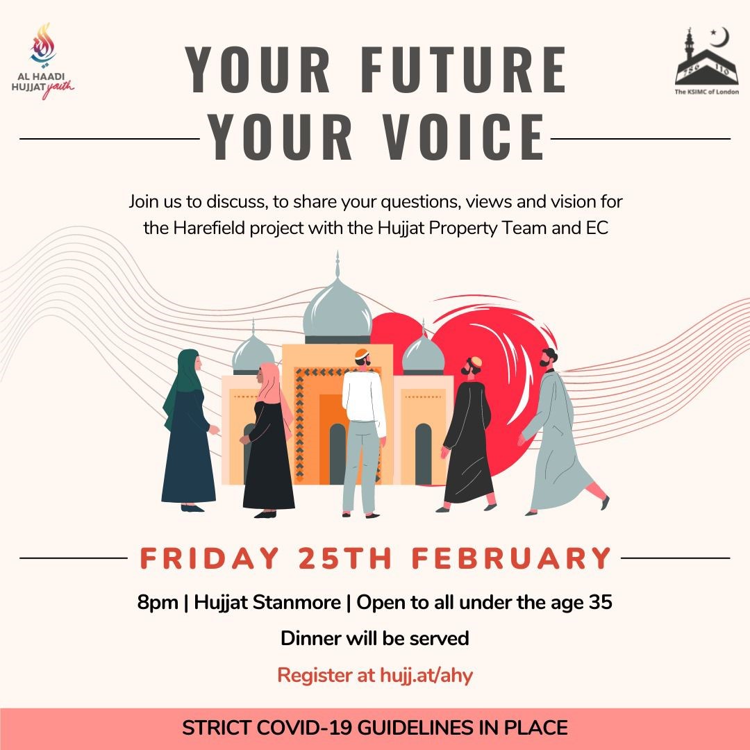 Join us for an informal evening with the Hujjat EC and Property Team to share your views and have your questions answered about the Harefield project.