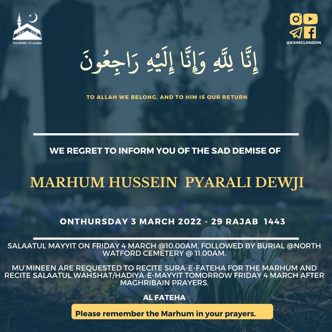 We regret to inform you of the sad demise of Marhum Hussein Pyarali Dewji, father of Ahmed Dewji and Sajidabai Dhanji who passed away today in London and will be buried tomorrow Friday 4 March 2022.