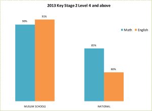 On average 91 per cent of students sitting their KS2 (or equivalent) tests last year in Muslim schools reached Level 4 and above in English which is 11 per cent higher than the national average. For Math 90 per cent of students in Muslim schools reached Level 4 and above, 5 per cent higher than the national average.