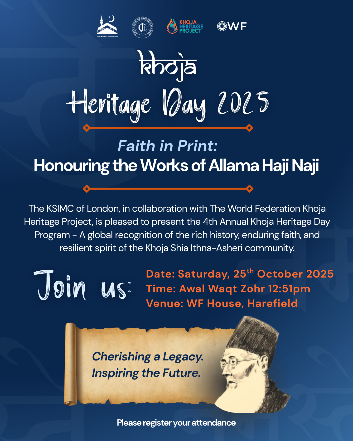 The KSIMC of London, Council of European Jamaats and The World Federation present the 4th Annual Khoja Heritage Day Program – A global recognition of the rich history, enduring faith, and resilient spirit of the Khoja Shia Ithna-Asheri community.