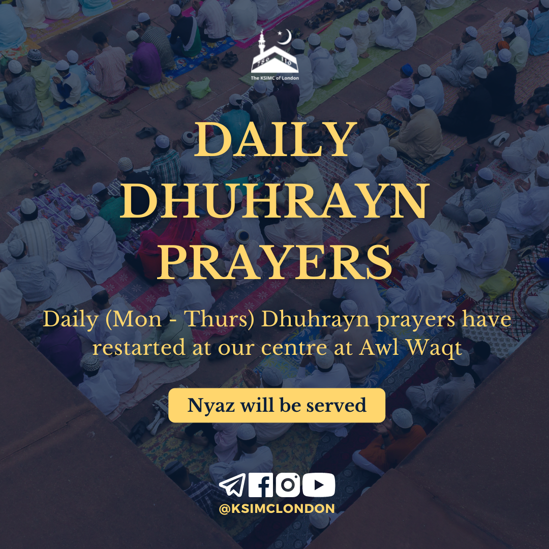 We will insha’Allah be resuming Daily dhuhrayn Jamaat prayers at our centre from Monday to Thursday at Awl Waqt. All members are encouraged to attend.