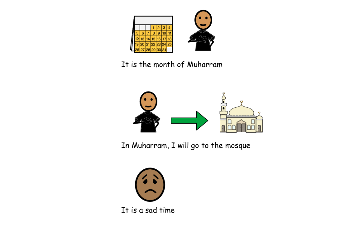 You can present it to your child when you are both calm and relaxed and introduce it, something like this… “I have a story for you, it is about Muharram. Let me read it for you”. You can then read through the words and look at the symbols together. If your child asks questions, you can always add more details. You can decide if you want to read it in the morning, or evening. We would recommend reading it for a few days before Muharram starts, as light preparation. You can then read it again just before your first visit for a Muharram event, or even in the car on the way to mosque – “remember the story about Muharram? I am going to read it again. We are going to mosque today for Muharram” and proceed to read the social story to your child.