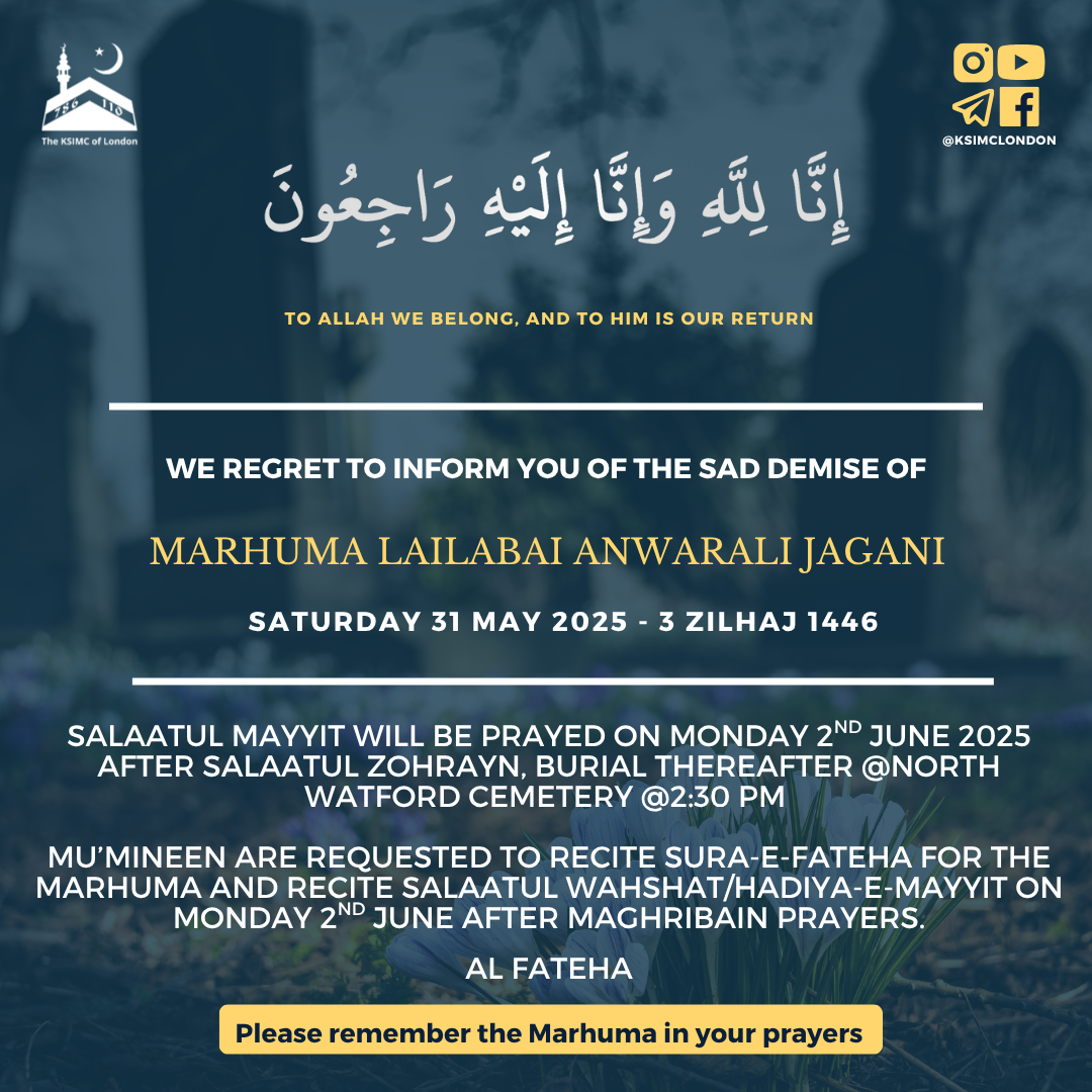 Mu’mineen are requested to recite Sura-e-Fateha for the Marhum and recite Salaatul Wahshat/Hadiya-e-Mayyit tonight after Maghribain prayers