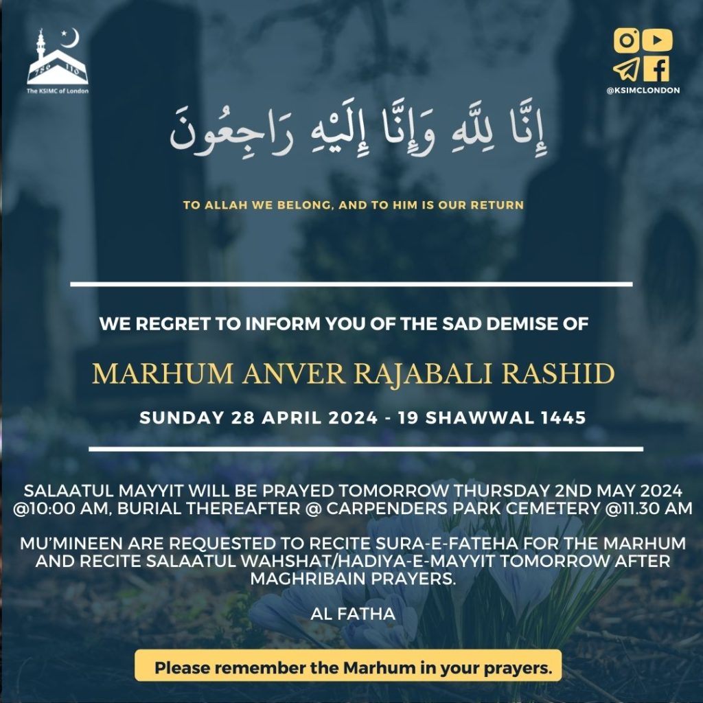 Salaatul Mayyit will be prayed tomorrow, Thursday 2nd May @10:00 am, Burial thereafter @ Carpenders Park Cemetery @11:30 am