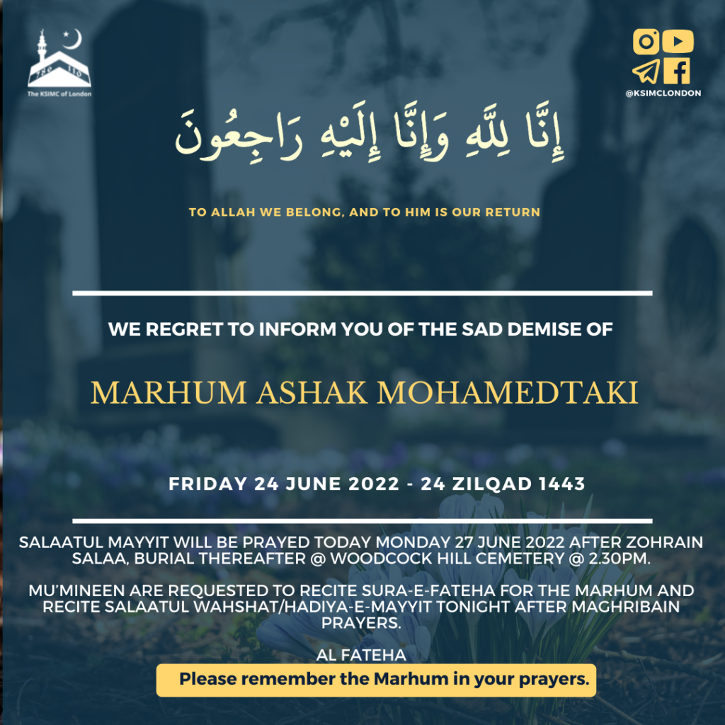 We regret to inform you of the sad demise of Marhum Ashak Mohamedtaki passed away today in London and will be buried today Monday 27 June 2022..
