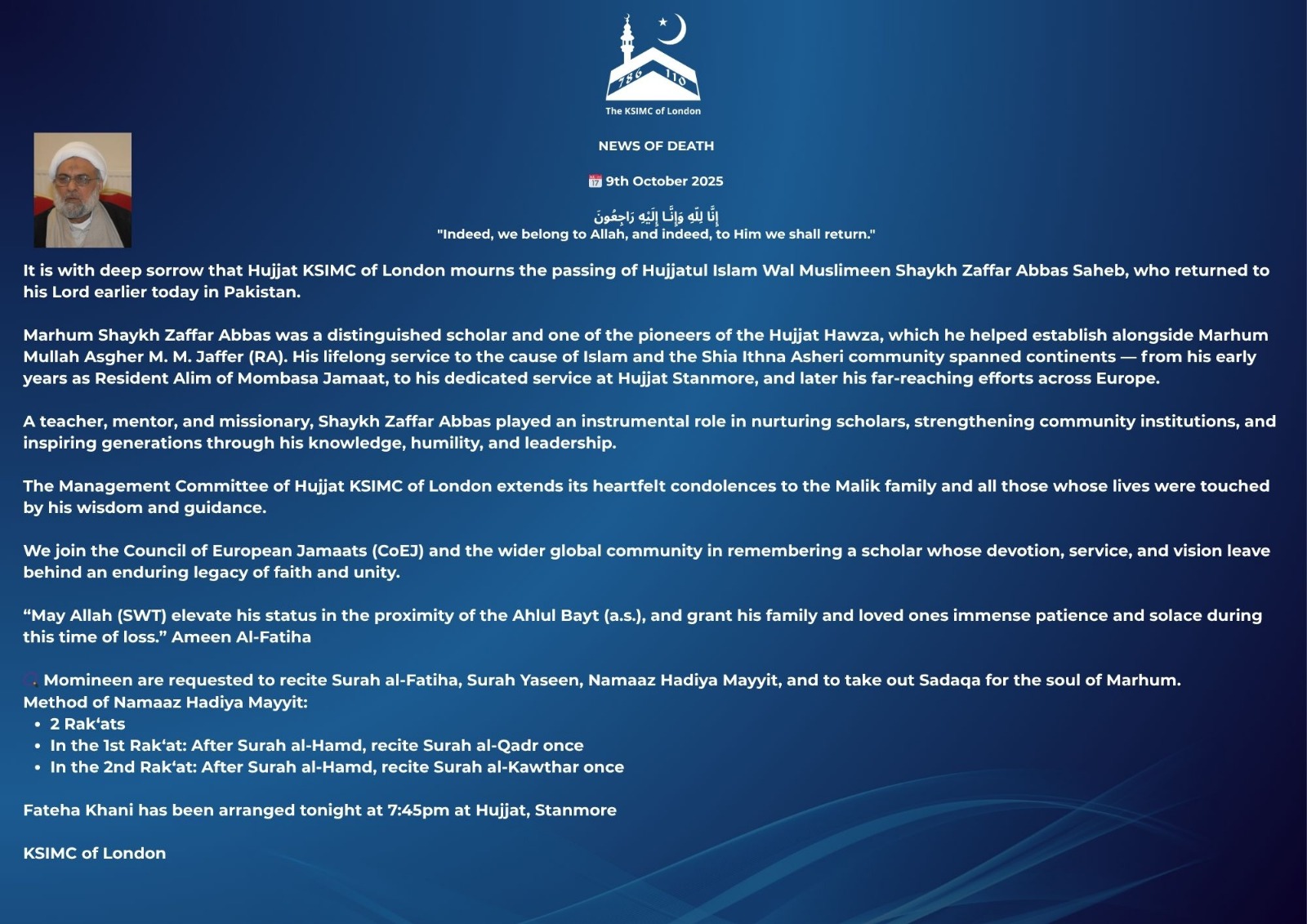 We regret to inform you of the sad demise of Marhum Syed Aun Ali Kazmi who passed away yesterday in London and will be buried tomorrow Saturday 15 October.