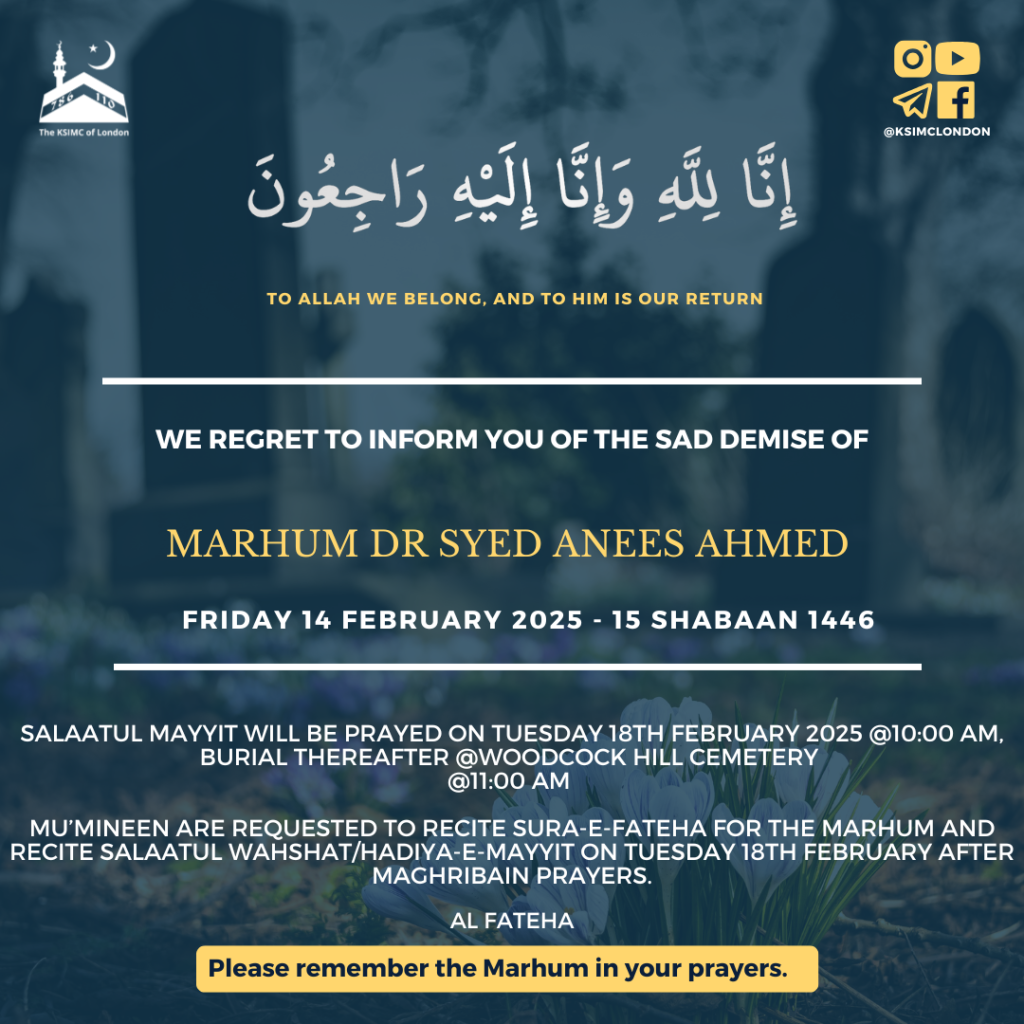 Mu’mineen are requested to recite Sura-e-Fateha for the Marhum and recite Salaatul Wahshat/Hadiya-e-Mayyit on Tuesday 18th February after Maghribain prayers