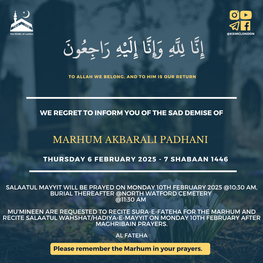 We regret to inform you of the sad demise of Marhum Ferozali Gulamali Meherali of London who passed away on Monday 15th December 2025. Marhum was the husband of Late Parin Meherali.