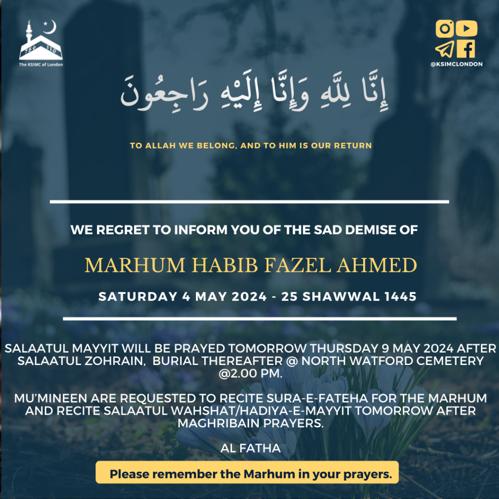We regret to inform you of the sad demise of Marhum Habib Fazel Ahmed who passed away in London and will be buried tomorrow Thursday 9 May 2024.