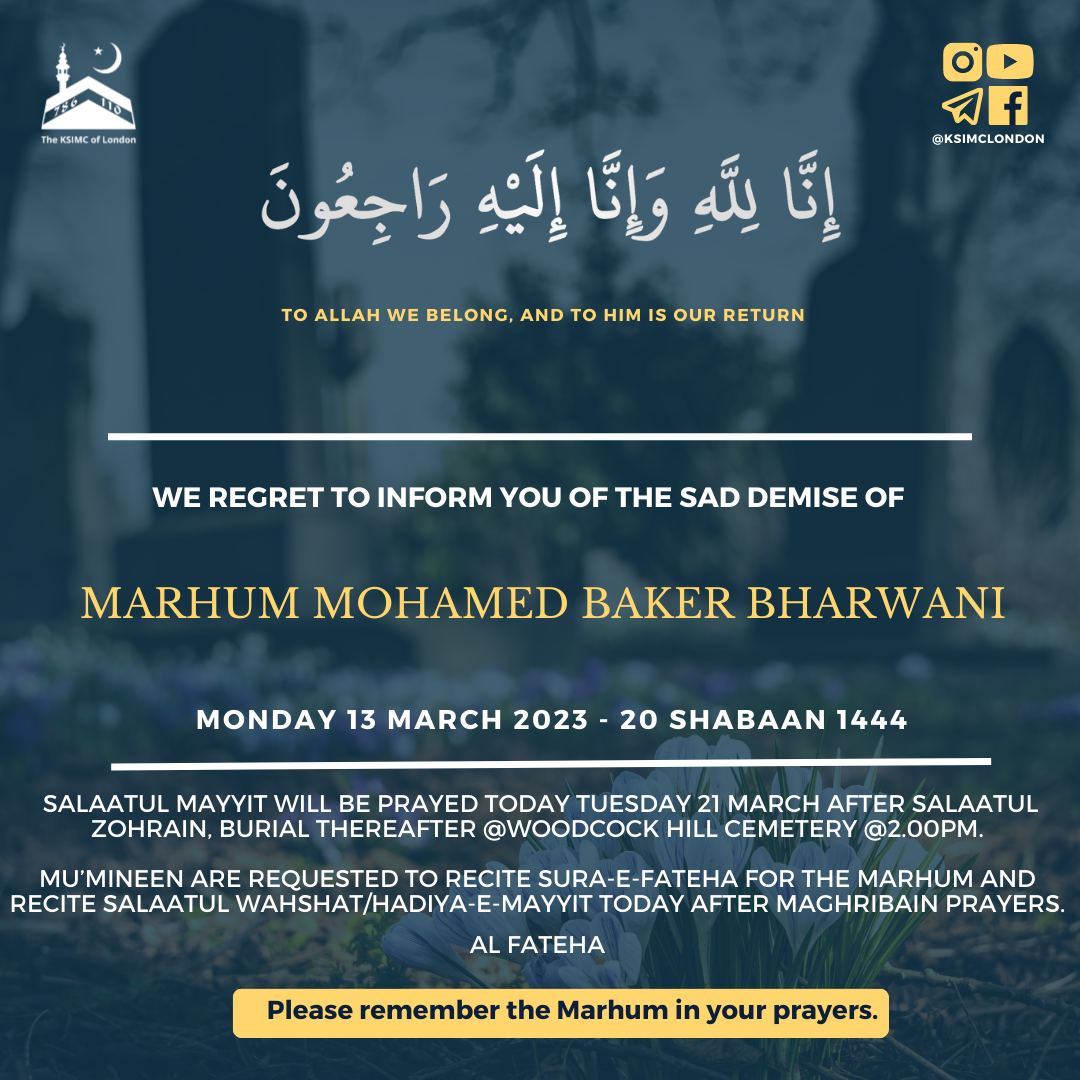 Mu’mineen are requested to recite Sura-e-Fateha for the Marhum and recite Salaatul Wahshat/Hadiya-e-Mayyit tomorrow after Maghribain prayers