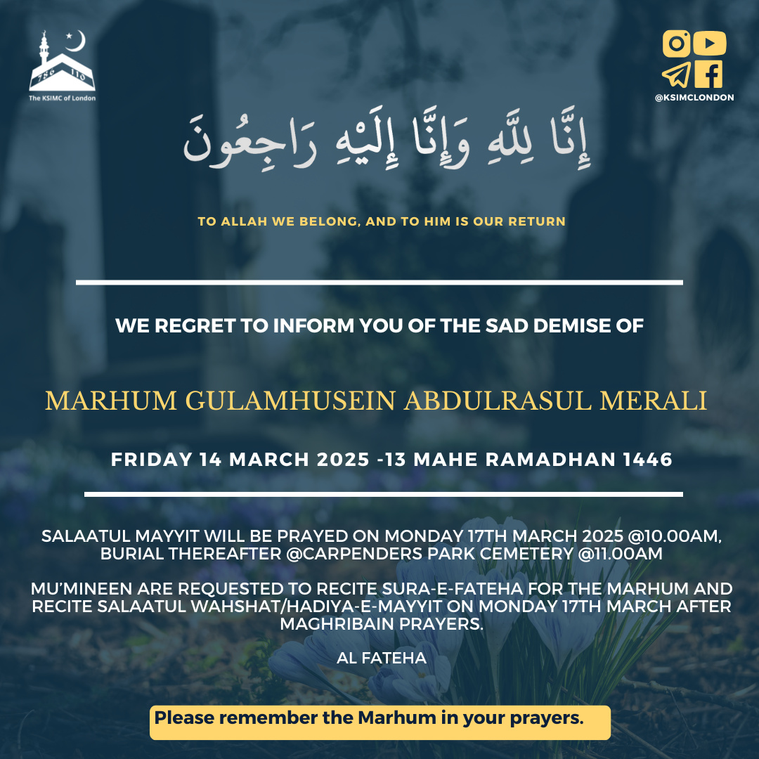 Salatul Mayat/Tilwat e Quran for Marhum HUSSEIN JIWA HASHAM will be offered on Thursday 4th December 2025 after Zohar/Asr salah at Stanmore Imambargah.