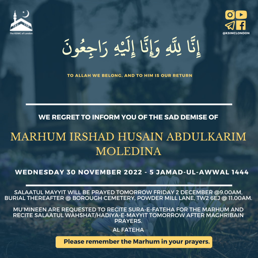 We regret to inform you of the sad demise of Marhum Irshad Husain Abdulkarim Moledina of London who passed away on Wednesday.