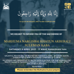 Mu’mineen are requested to recite Sura-e-Fateha for the Marhum and recite Salaatul Wahshat/Hadiya-e-Mayyit on Wednesday 10 May after Maghribain prayers.