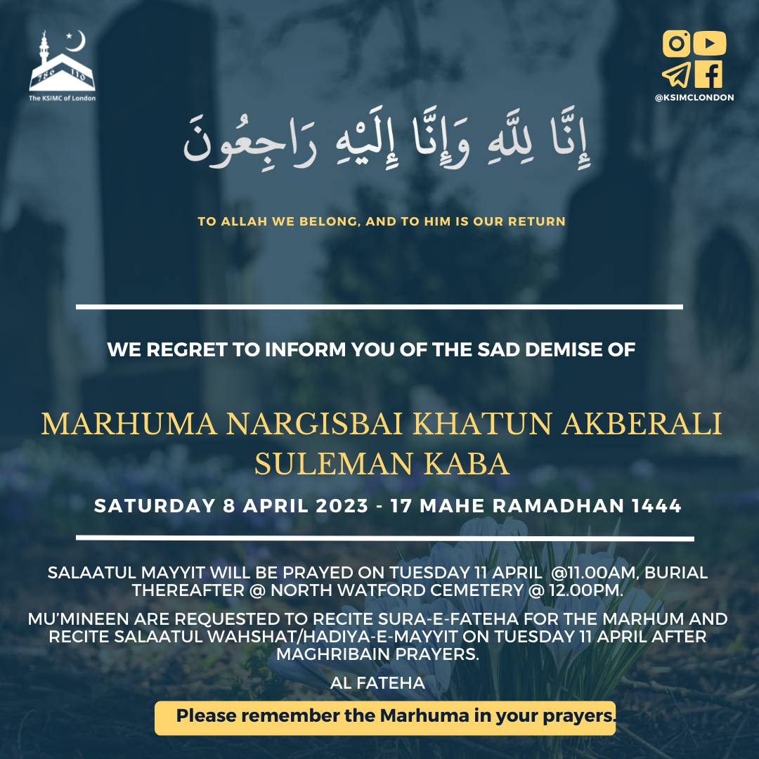 Salaatul Mayyit will be prayed on Wednesday 10 May 2023 @10.15am, burial thereafter @North Watford Cemetery @11.00am.