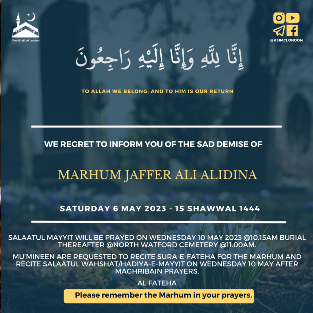 We regret to inform you of the sad demise of Marhum Jaffer Ali Alidina who passed away in Luton.
