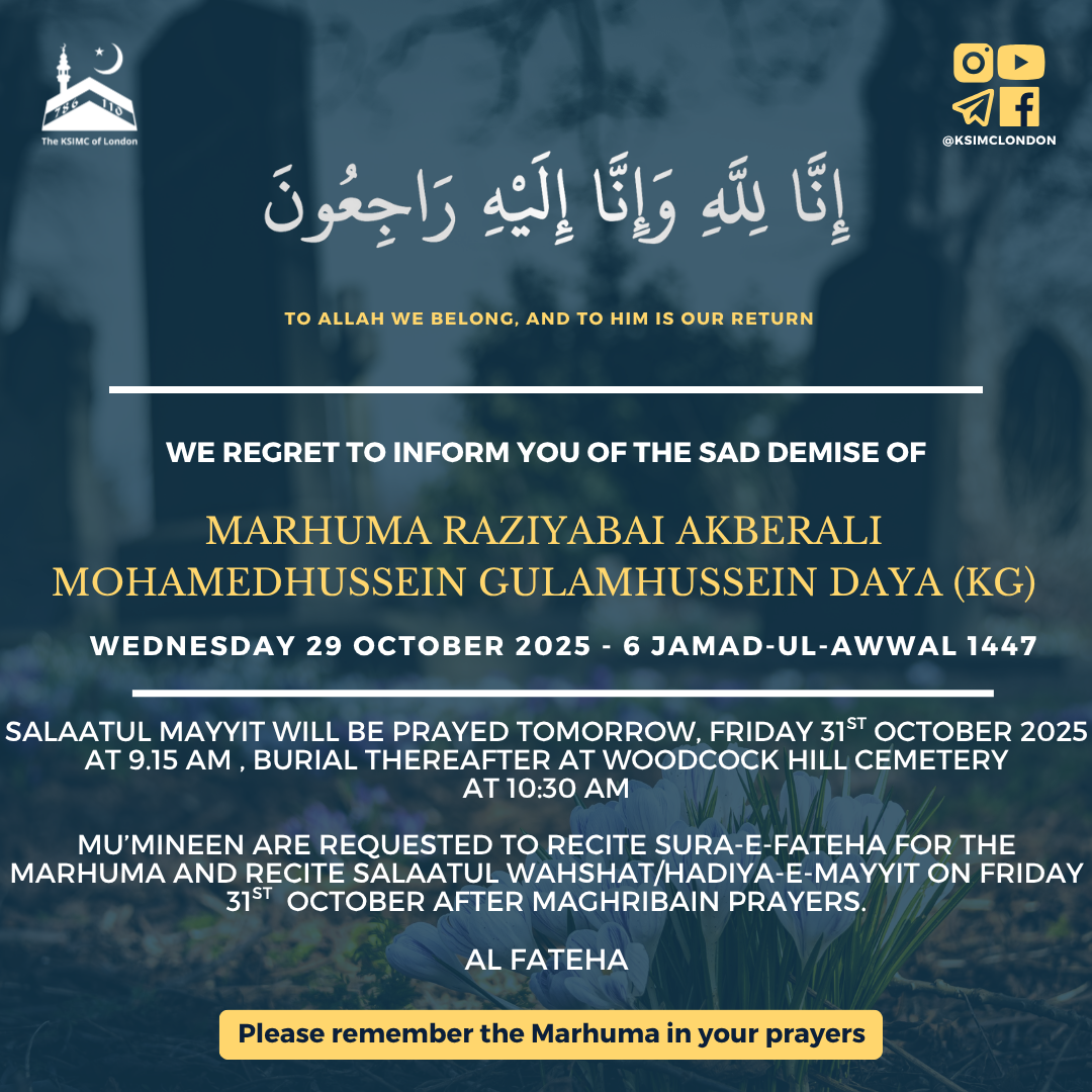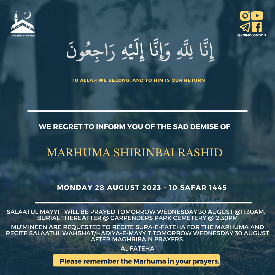 Salaatul Mayyit will be prayed tomorrow, Tuesday 12th August 2025 after Salaatul Zohrayn, burial thereafter @Carpenders Park Cemetery @2.15 pm.