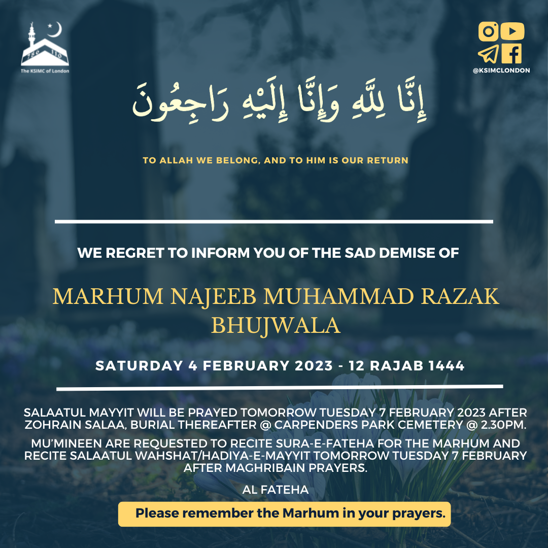 Mu’mineen are requested to recite Sura-e-Fateha for the Marhum and recite Salaatul Wahshat/Hadiya-e-Mayyit today after Maghribain prayers.