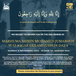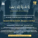 Mu’mineen are requested to recite Sura-e-Fateha for the Marhum and recite Salaatul Wahshat/Hadiya-e-Mayyit on Monday 15th September 2025 after Maghribain prayers