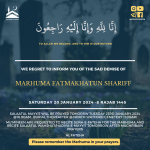 Salaatul Mayyit will be prayed on Monday 15th September 2025 after Salaatul Zohrayn, burial thereafter @Carpenders Park Cemetery @2.00 pm.