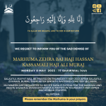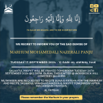 Mu’mineen are requested to recite Sura-e-Fateha for the Marhum and recite Salaatul Wahshat/Hadiya-e-Mayyit tomorrow Wednesday 15 March after Maghribain prayers.