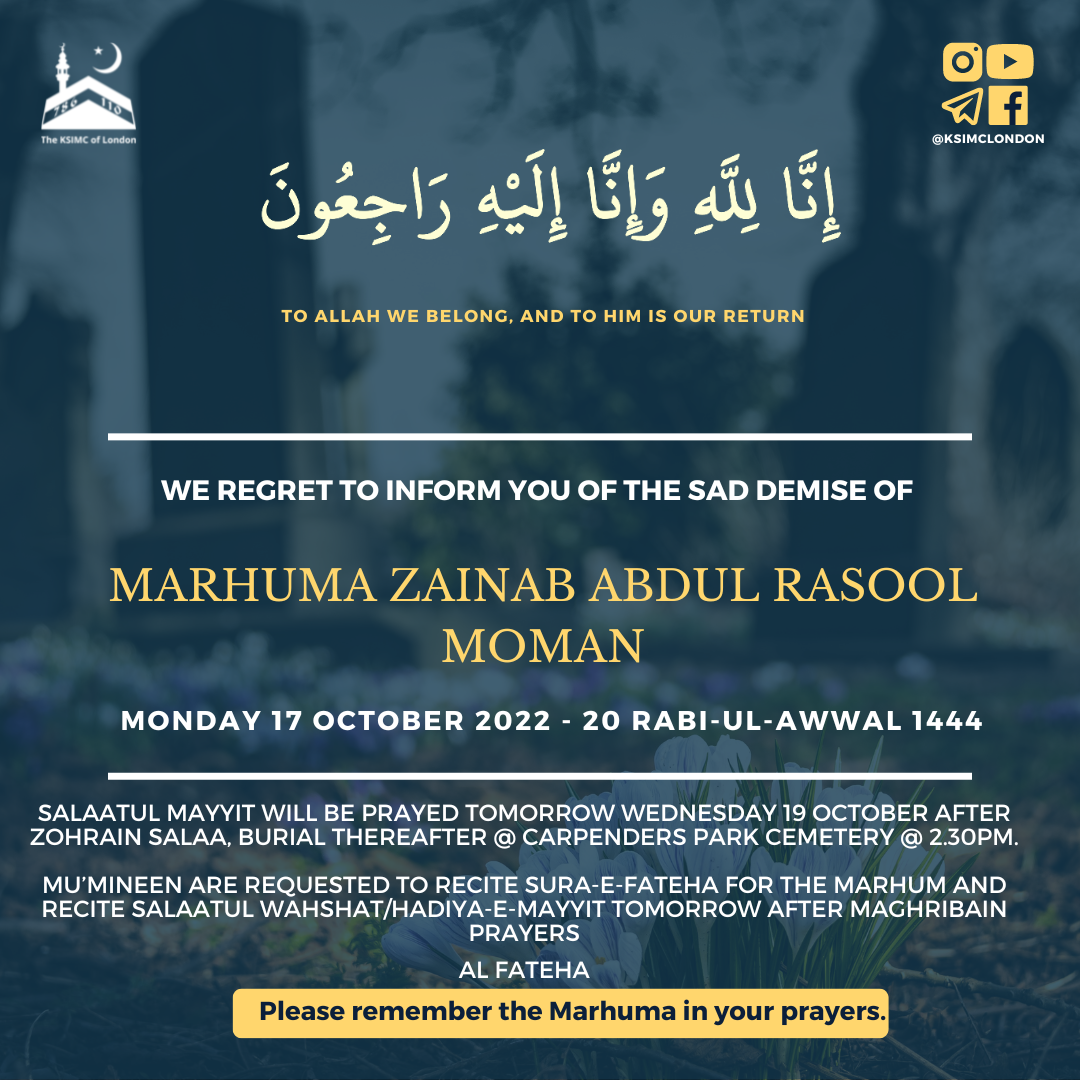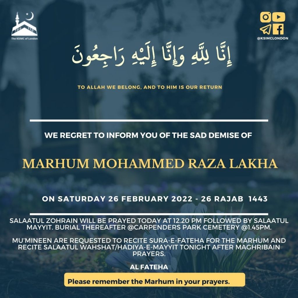 Mu’mineen are requested to recite Sura-e-Fateha for the Marhum and recite Salaatul Wahshat/Hadiya-e-Mayyit on Tuesday 1st April after Maghribain prayers