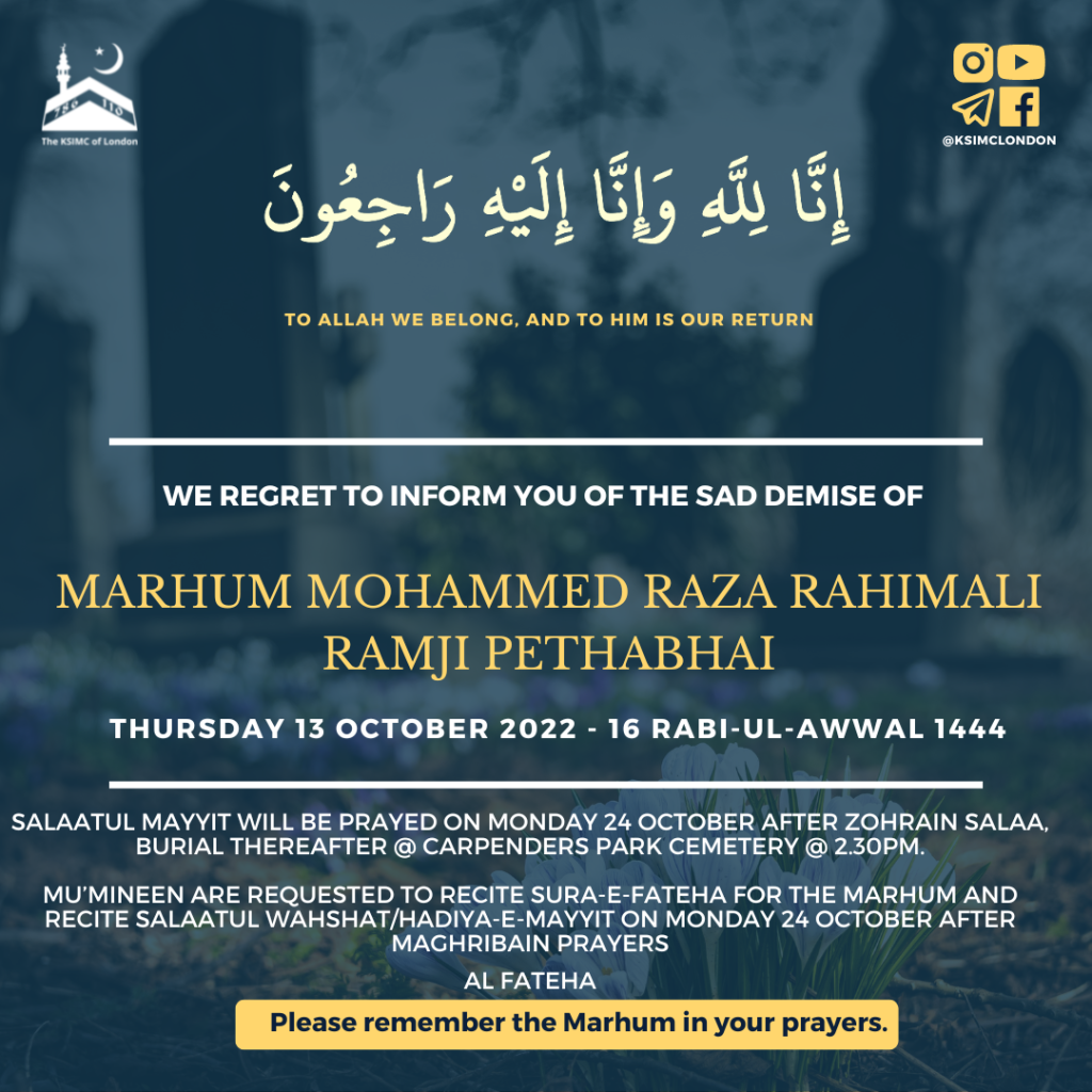 We regret to inform you of the sad demise of Marhum Mohammed Raza Rahimali Ramji Pethabhai of London who passed away last week and will be buried on Monday 24 October 2022.