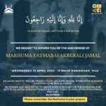 Salaatul Mayyit will be prayed on Saturday 27th January 2024 after Salaatul Zohrain, Burial thereafter @Carpenders park Cemetery @1.30pm.