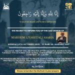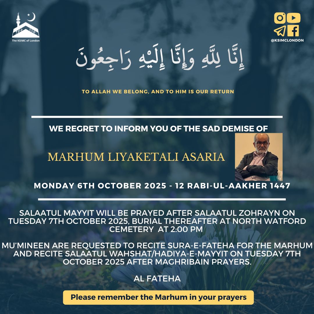 Mu’mineen are requested to recite Sura-e-Fateha for the Marhum and recite Salaatul Wahshat/Hadiya-e-Mayyit on Saturday 27th January 2024 after Maghribain prayers