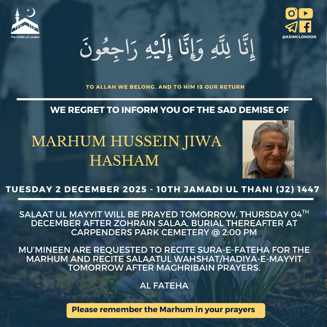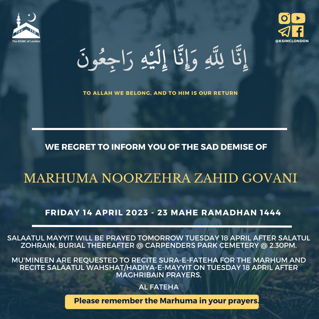 Mu’mineen are requested to recite Sura-e-Fateha for the Marhum and recite Salaatul Wahshat/Hadiya-e-Mayyit tomorrow after Maghribain prayers