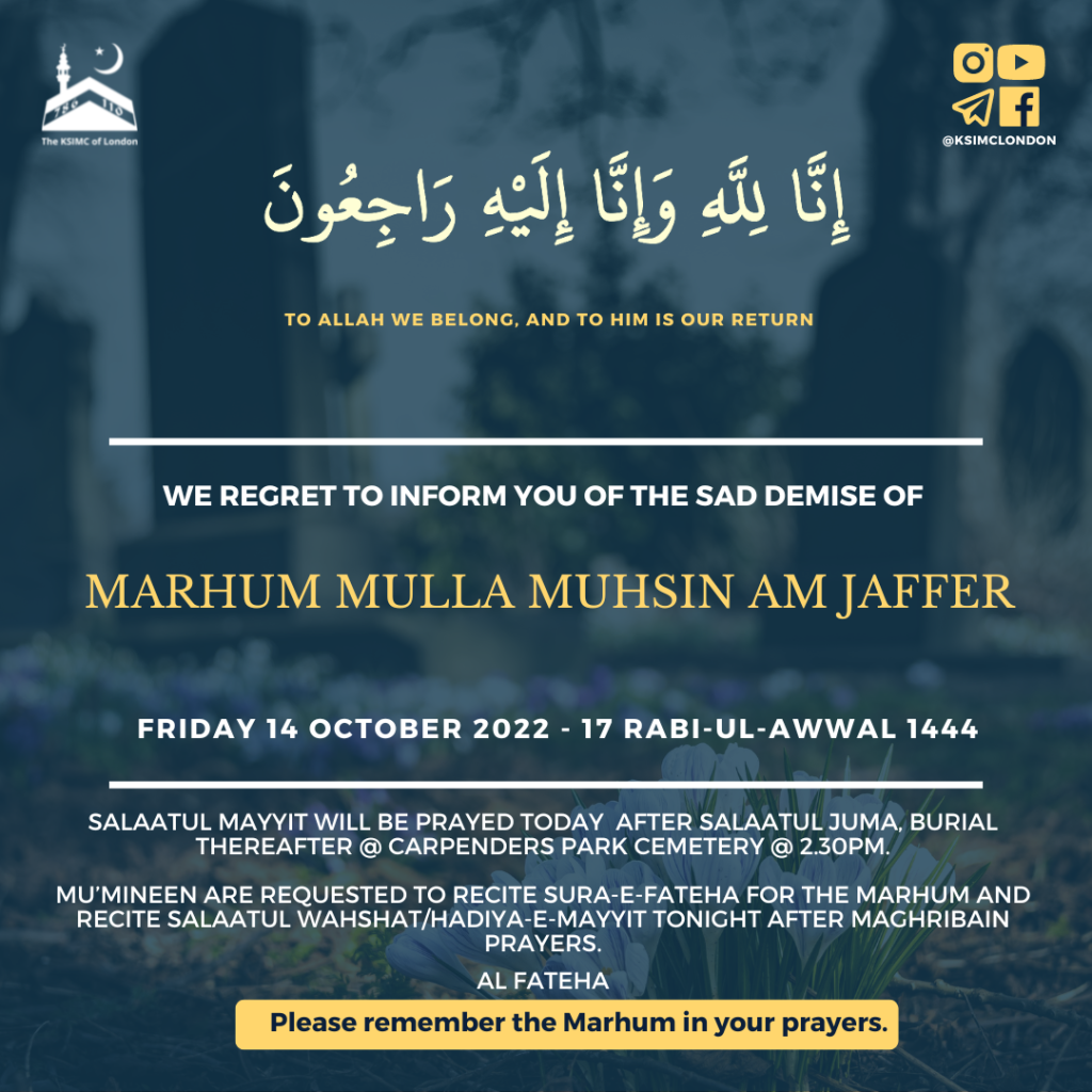 We regret to inform you of the sad demise of Marhum Mulla Muhsin AM Jaffer father of Shaykh Mustafa Jaffer who passed away today in London and will be buried today.