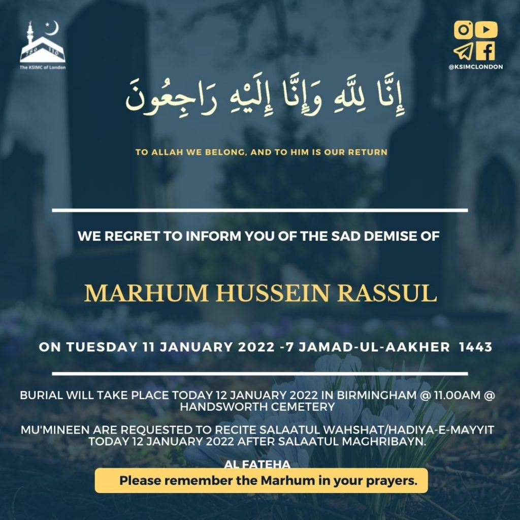 Mu’mineen are requested to recite Sura-e-Fateha for the Marhum and recite Salaatul Wahshat/Hadiya-e-Mayyit on Saturday 15th November 2025 after Maghribain prayers