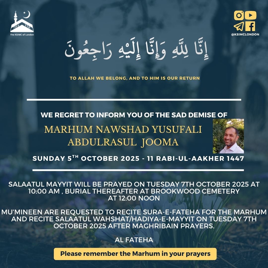 Mu’mineen are requested to recite Sura-e-Fateha for the Marhum and recite Salaatul Wahshat/Hadiya-e-Mayyit on Tuesday 6th January 2026 after Maghribain prayers