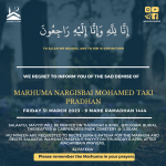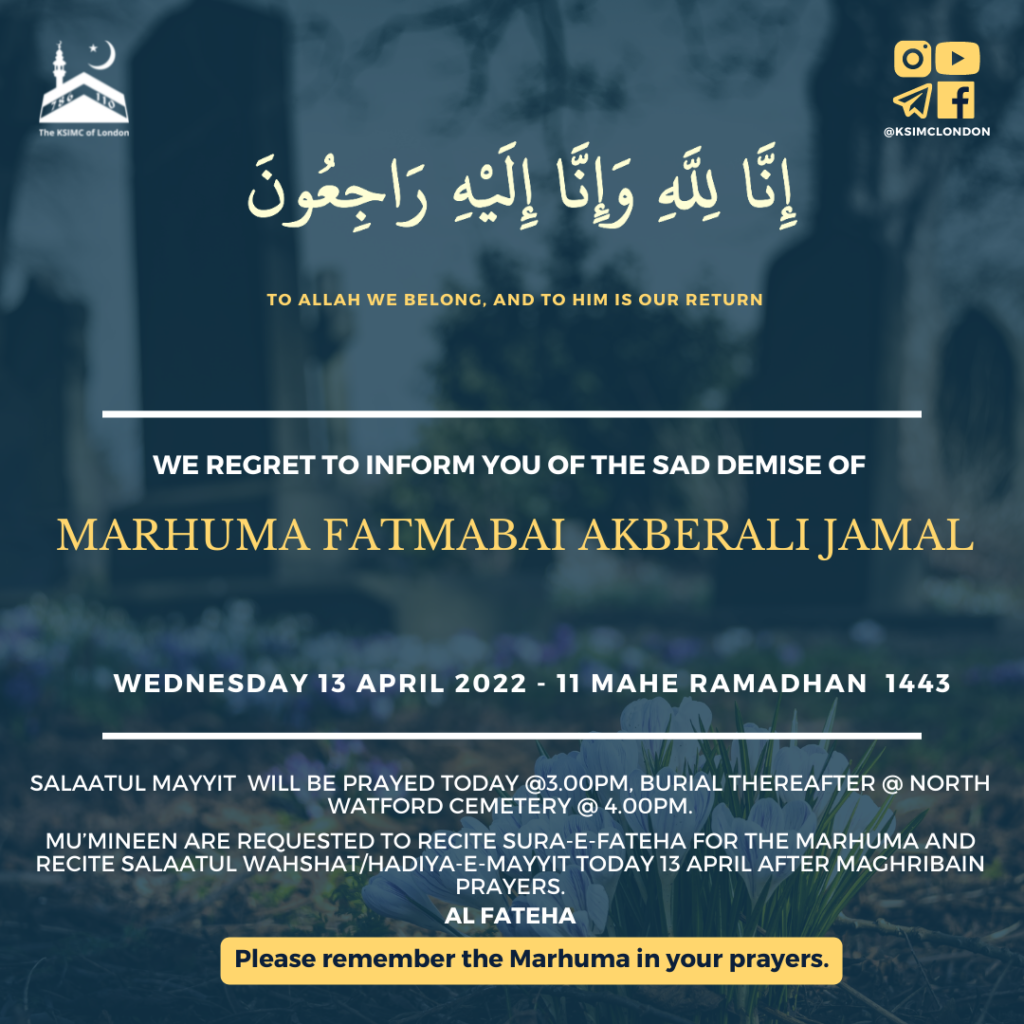 We regret to inform you of the sad demise of Marhuma Fatmabai Akberali Jamal passed away today in London and will be buried today.