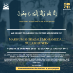 Mu’mineen are requested to recite Sura-e-Fateha for the Marhuma and recite Salaatul Wahshat/Hadiya-e-Mayyit tomorrow after Maghribain prayers.