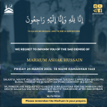 Mu’mineen are requested to recite Sura-e-Fateha for the Marhuma and recite Salaatul Wahshat/Hadiya-e-Mayyit on Monday after Maghribain prayers