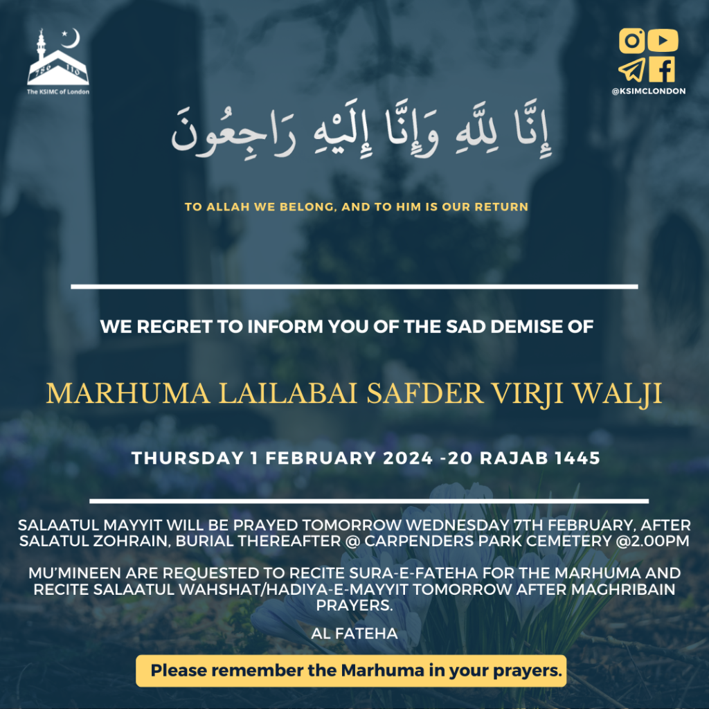 Mu’mineen are requested to recite Sura-e-Fateha for the Marhuma and recite Salaatul Wahshat/Hadiya-e-Mayyit tomorrow Wednesday 7th February 2024 after Maghribain prayers