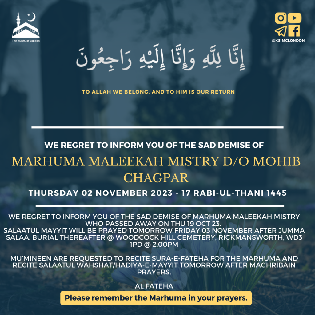 We regret to inform you of the sad demise of Marhuma Maleekah Mistry, who passed away in London on Thursday 19 October 2023.