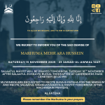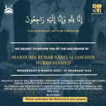 Mu’mineen are requested to recite Sura-e-Fateha for the Marhuma and recite Salaatul Wahshat/Hadiya-e-Mayyit tomorrow after Maghribain prayers.